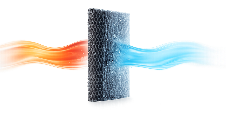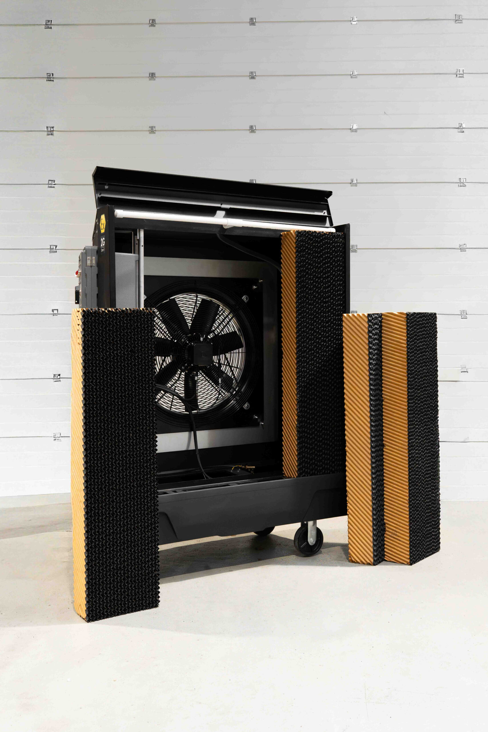Le ventilateur aspire l’air chaud extérieur. Puis, il lui fait traverser un média alvéolaire constamment humidifié. C’est en traversant ce panneau que l’air ambiant cède sa chaleur pour permettre l’évaporation de l’eau.